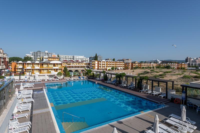 Krásný hotel s ideální polohou přímo u dlouhé a široké písečné pláže s výhledem na moře. Nachází se pouhých 800 metrů od hlavní promenády a blízko restaurací, obchodů, zastávky prázdninového vláčku a místní autobusové dopravy. Historické městečko Nesebar je vzdáleno pouze 3 km a aquapark jen 2,5 km. |