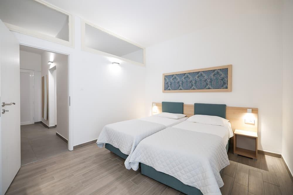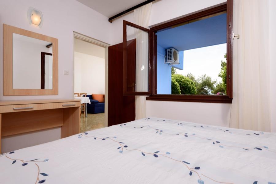 windsurfingový klub a školy. Všechny apartmány jsou vybaveny nádobím na jídlo a vaření podle počtu osob, dále kávovarem, varnou konvicí, mikrovlnnou troubou a fénem v koupelně. V obývacím pokoji je rozkládací pohovka (vhodná pro jedno dítě do 12 let), telefon, koupelna a WC, klimatizace v každém pokoji. V přízemí s terasou. Typ A (2+1) Superior **** - 42 m ² - jedna ložnice se dvěma lůžky, rozkládací pohovka v obývacím pokoji (vhodná pro jedno dítě do 12 let), telefon, koupelna a WC, klimatizace v každém pokoji. V přízemí s terasou. Typ B (4+1) Superior **** - 46 m ² - dvě ložnice se dvěma lůžky v každé místnosti, rozkládací pohovka v obývacím pokoji (vhodná pro jedno dítě max. 12 let), telefon, vana a WC, WC, klimatizace v každé místnosti. V prvním patře s balkonem. Studio (2) Superior **** - 31 m ² - jedna ložnice se dvěma lůžky, pohovka v obývacím pokoji, telefon, vana a WC, klimatizace v ložnici. V přízemí.