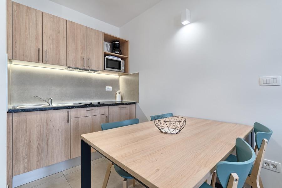 windsurfingový klub a školy. Všechny apartmány jsou vybaveny nádobím na jídlo a vaření podle počtu osob, dále kávovarem, varnou konvicí, mikrovlnnou troubou a fénem v koupelně. V obývacím pokoji je rozkládací pohovka (vhodná pro jedno dítě do 12 let), telefon, koupelna a WC, klimatizace v každém pokoji. V přízemí s terasou. Typ A (2+1) Superior **** - 42 m ² - jedna ložnice se dvěma lůžky, rozkládací pohovka v obývacím pokoji (vhodná pro jedno dítě do 12 let), telefon, koupelna a WC, klimatizace v každém pokoji. V přízemí s terasou. Typ B (4+1) Superior **** - 46 m ² - dvě ložnice se dvěma lůžky v každé místnosti, rozkládací pohovka v obývacím pokoji (vhodná pro jedno dítě max. 12 let), telefon, vana a WC, WC, klimatizace v každé místnosti. V prvním patře s balkonem. Studio (2) Superior **** - 31 m ² - jedna ložnice se dvěma lůžky, pohovka v obývacím pokoji, telefon, vana a WC, klimatizace v ložnici. V přízemí.