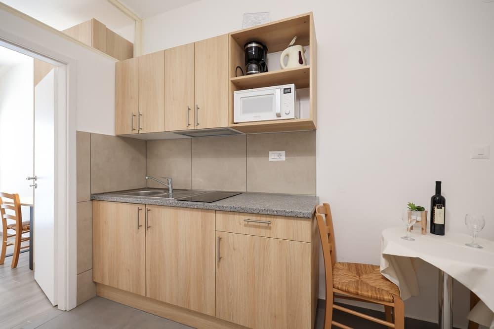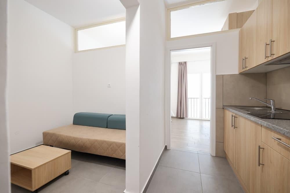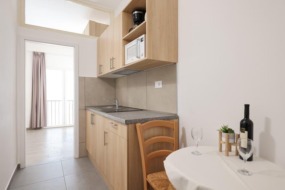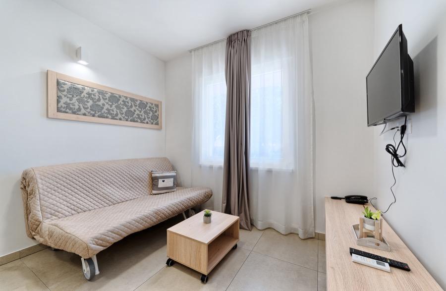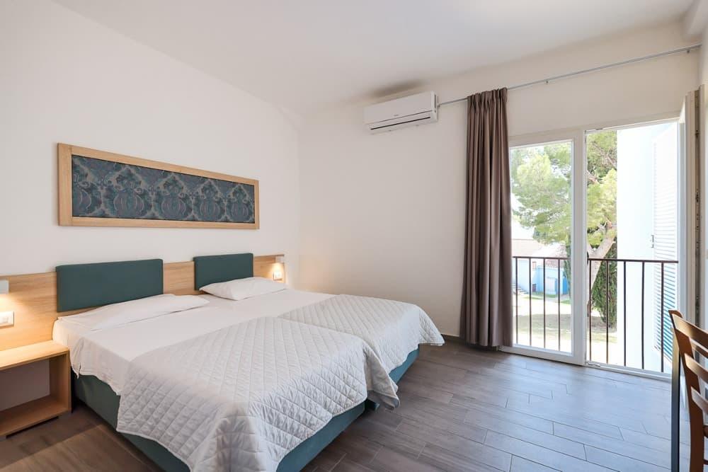 windsurfingový klub a školy. Všechny apartmány jsou vybaveny nádobím na jídlo a vaření podle počtu osob, dále kávovarem, varnou konvicí, mikrovlnnou troubou a fénem v koupelně. V obývacím pokoji je rozkládací pohovka (vhodná pro jedno dítě do 12 let), telefon, koupelna a WC, klimatizace v každém pokoji. V přízemí s terasou. Typ A (2+1) Superior **** - 42 m ² - jedna ložnice se dvěma lůžky, rozkládací pohovka v obývacím pokoji (vhodná pro jedno dítě do 12 let), telefon, koupelna a WC, klimatizace v každém pokoji. V přízemí s terasou. Typ B (4+1) Superior **** - 46 m ² - dvě ložnice se dvěma lůžky v každé místnosti, rozkládací pohovka v obývacím pokoji (vhodná pro jedno dítě max. 12 let), telefon, vana a WC, WC, klimatizace v každé místnosti. V prvním patře s balkonem. Studio (2) Superior **** - 31 m ² - jedna ložnice se dvěma lůžky, pohovka v obývacím pokoji, telefon, vana a WC, klimatizace v ložnici. V přízemí.